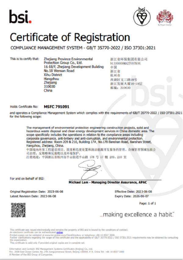 为响应省国资委合规管理体系建设要求,进一步加强法治国企建设,全力打造先行合规示范窗口,省环保集团自2022年7月起积极开展合规管理示范企业创建工作。通过制定详细实施方案、认真学习ISO37301国际标准、对标央企合规管理等举措,近日,省环保集团顺利通过了国际领先标准、测试及认证机构BSI审核,成为国内首个通过BSI合规管理体系GB/T 35770-2022 / ISO 37301:2021认证的环保集团。